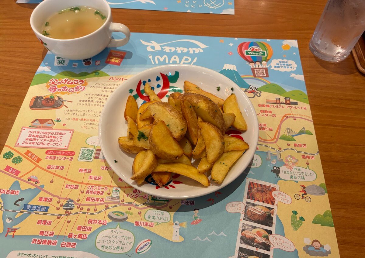 さらにサイドメニューには、、店員さんがおすすめしてくれたので湖西浜名湖店限定の「炭焼きゴロゴロ野菜の盛り合わせ」と、子供が喜びそうな「フライドポテト」も追加で注文。